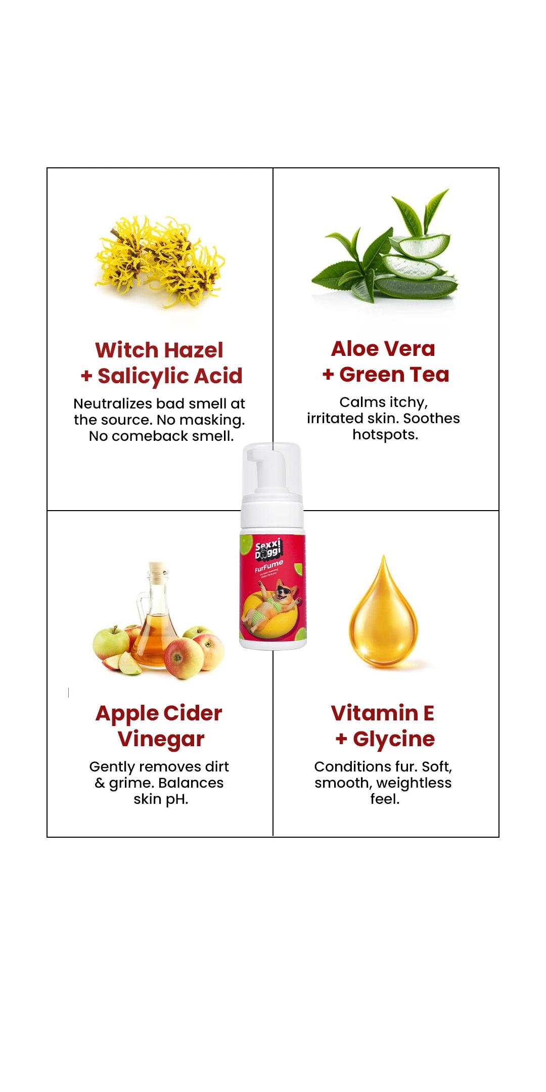 -Designed as a waterless foaming cleaner, this furfume refreshes fur without the stress of baths or rinsing. The lightweight foam cleans deeper, tackles bad odour at the source, and leaves fur soft, not sticky or greasy. Enriched with Aloe, Neem, and Calendula, it keeps the coat clean, glossy, and irresistibly smooth between washes. And that rich coffee fragrance? Fresh, cuddly, and dangerously sniff-worthy, no bath required. Daily baths? Not anymore.