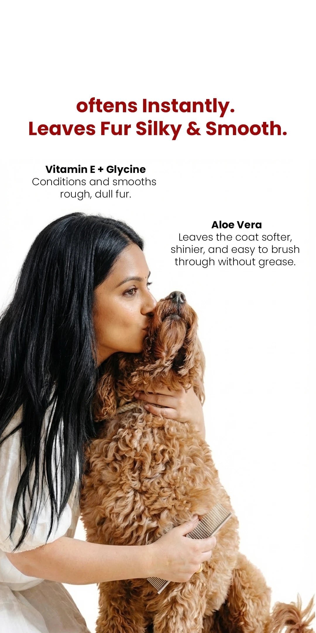 - Coat-softening blend that leaves fur fluffy, not sticky.